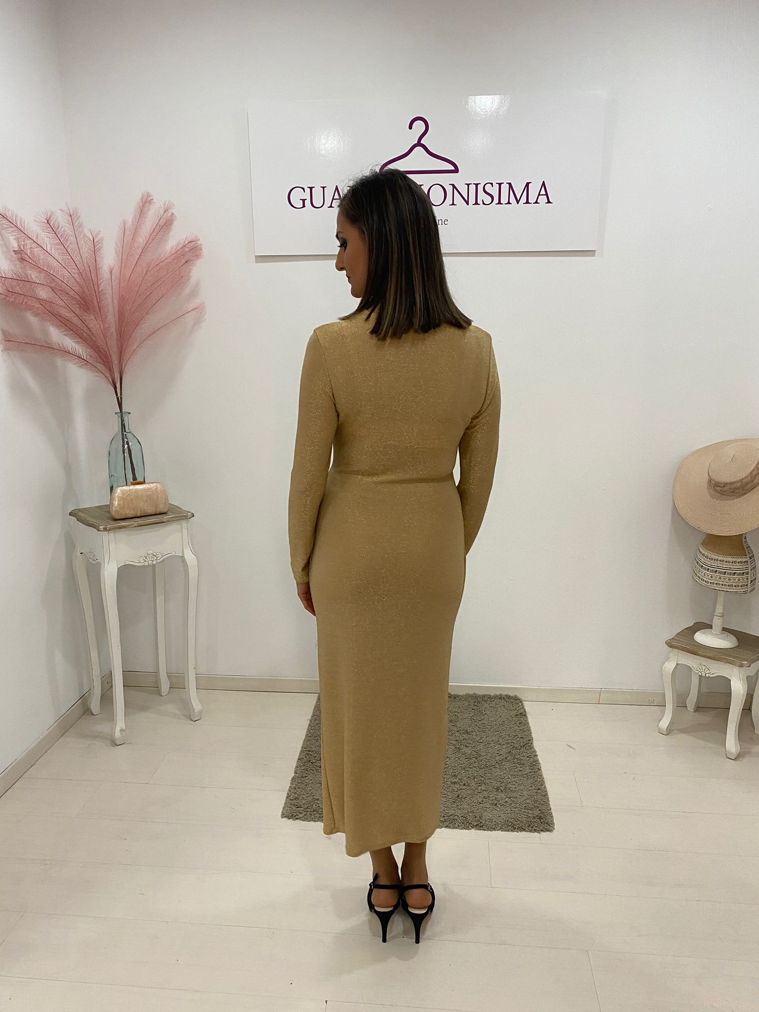 Vestido midi confeccionado en punto, el tejido lleva brillo y hace unos destellos preciosos a la luz, presenta fruncido lateral y escote a la caja. Ideal para cenas y fiestas. Color Champán.